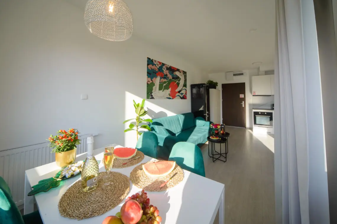 Modern apartment at Toruńska 22, Gdańsk, close to the Old Town 🏰. It features a bedroom, living room with TV, kitchenette, bathroom with shower 🚿, and a garage (extra fee) 🚗. Our team is available here, and you can store luggage at our office.
